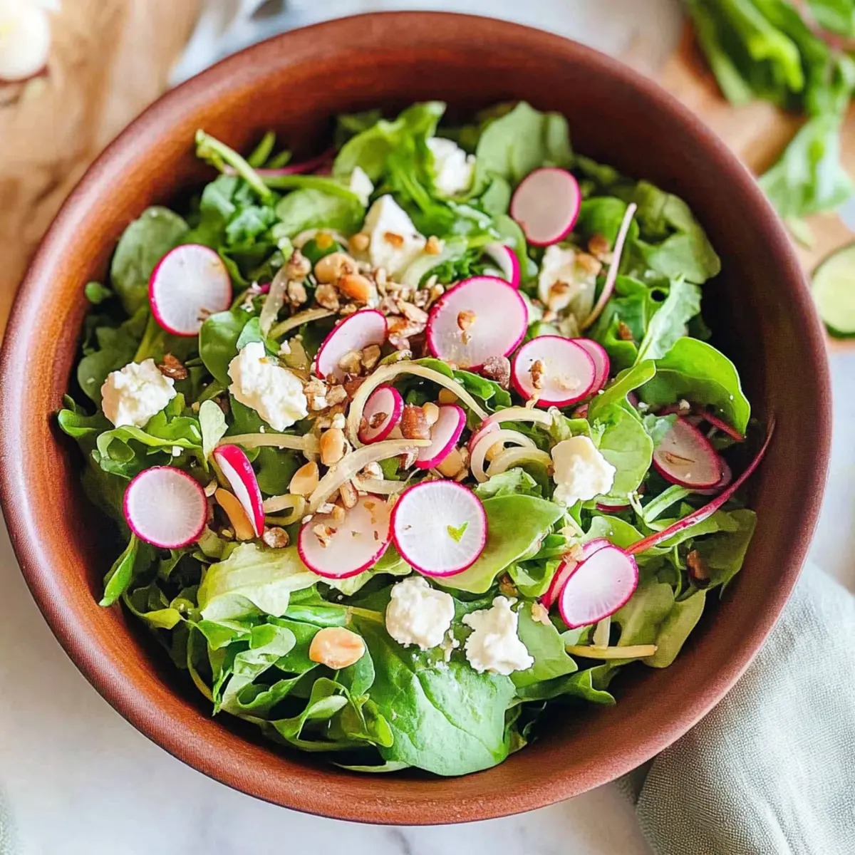 Freshness in every bite: This salad celebrates the season’s bounty with its vibrant baby greens and crisp radishes, capturing the spirit of spring.
