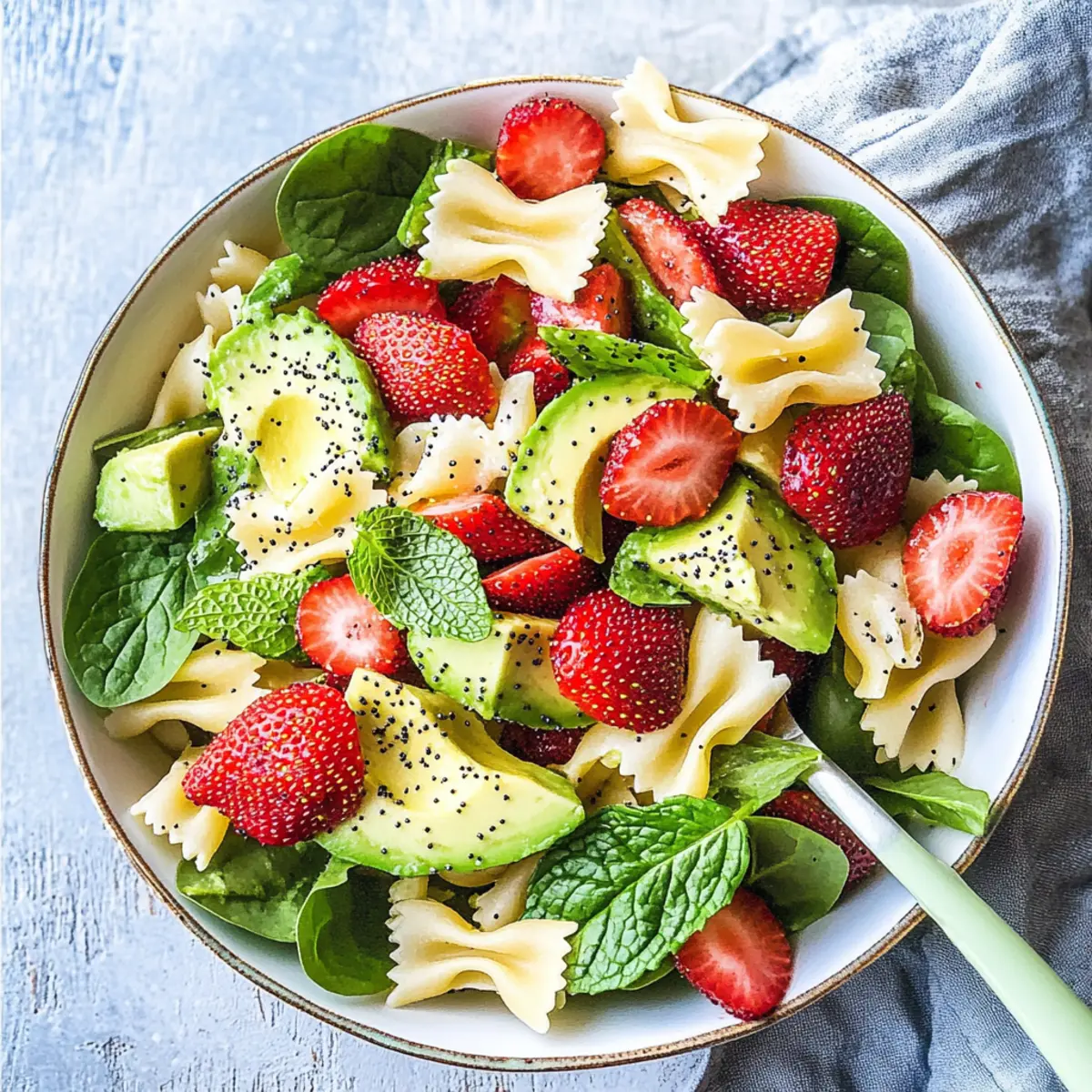 2. In a mixing bowl, combine cooled pasta with baby spinach, strawberries, avocados, green onions, and poppy seeds. Toss gently.