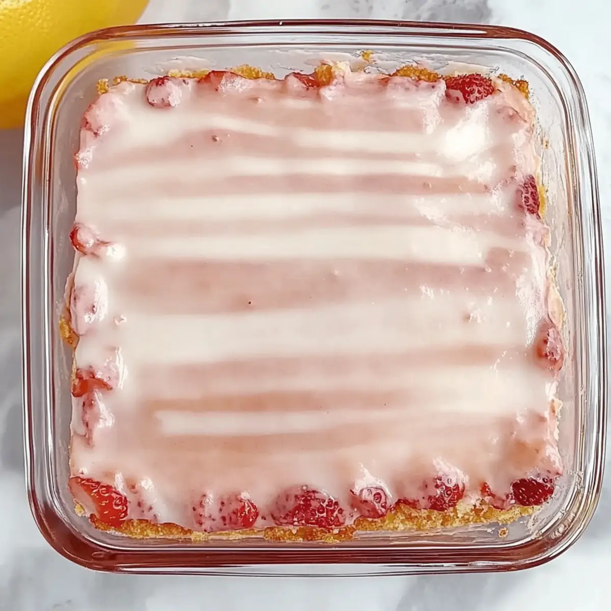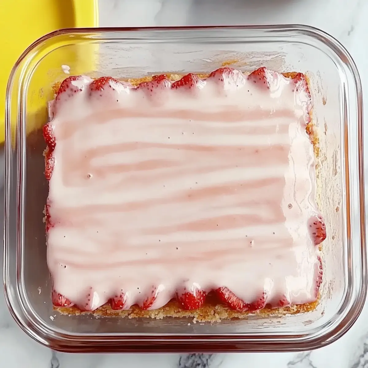 Once baked, remove the Strawberry Honeybun Cake from the oven and let it cool slightly in the pan for about 10-15 minutes. Meanwhile, prepare your icing by mixing powdered sugar with milk until you achieve a smooth glaze. It should be pourable but not too runny, perfect for drizzling on top.