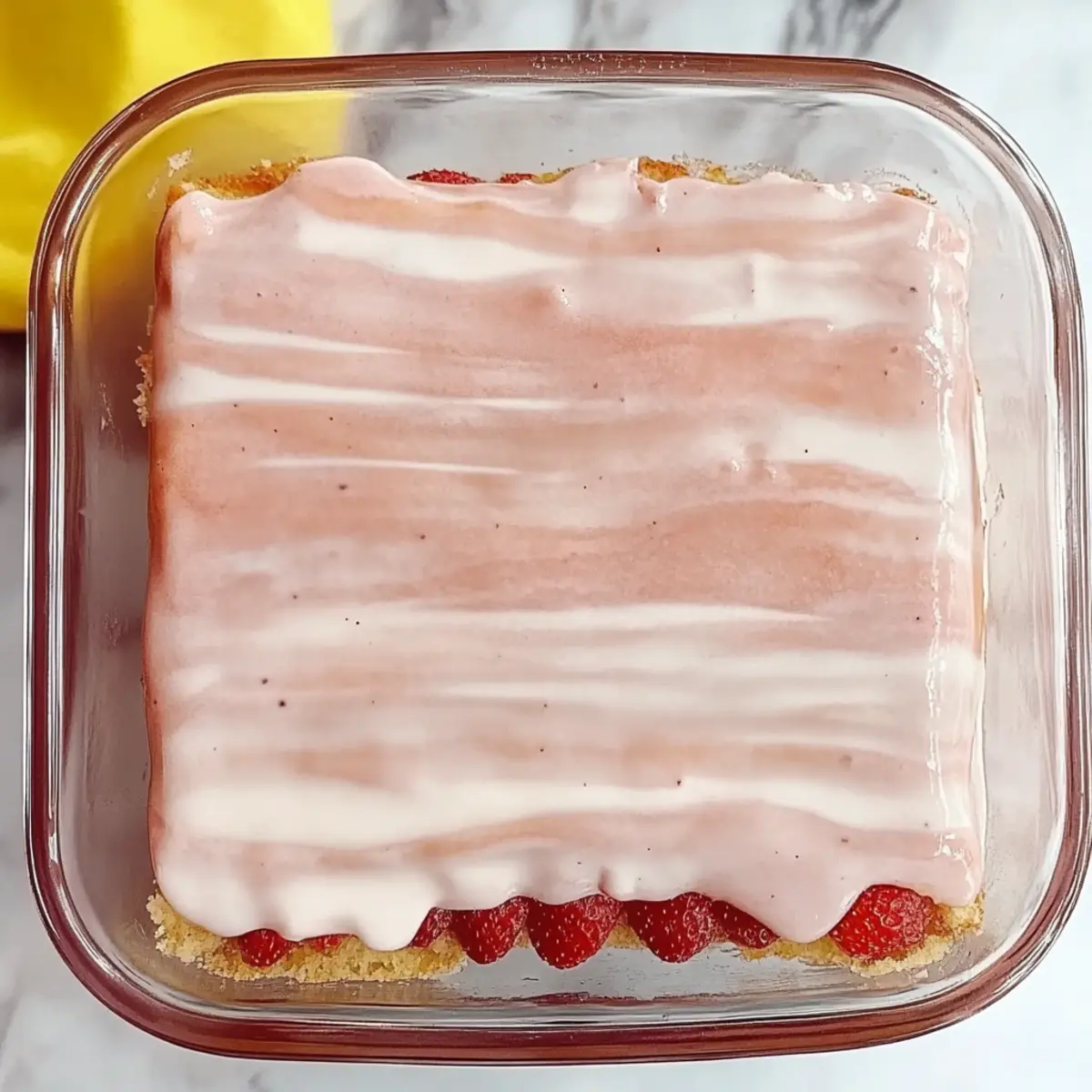 After the cake has cooled a bit, pour the prepared icing over the warm cake, allowing it to seep into every nook. This icing will enhance the sweetness and add a delightful finish to your Strawberry Honeybun Cake. Let the cake cool completely before slicing to enjoy the beautiful layers and flavors.