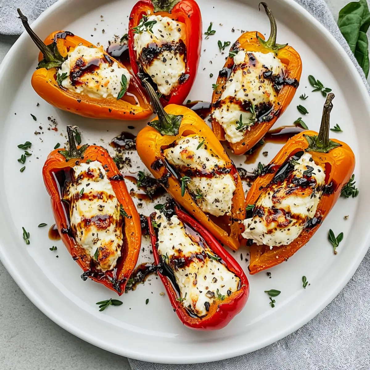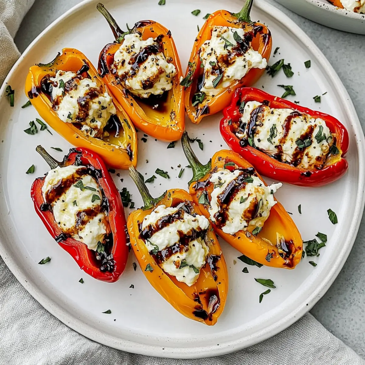 Stuffed Mini Peppers are a healthy appetizer filled with creamy goat cheese and drizzled with balsamic glaze, perfect for gatherings.