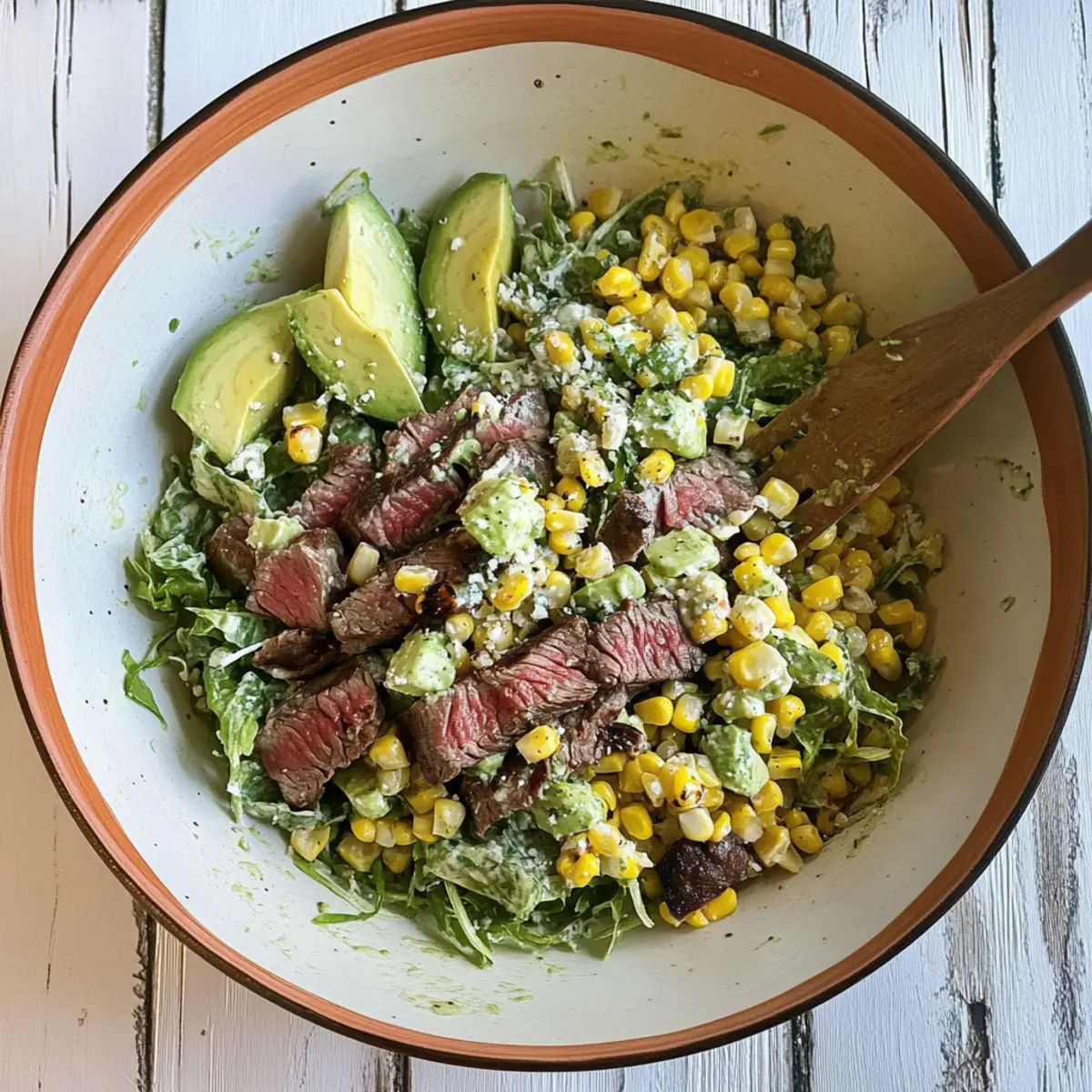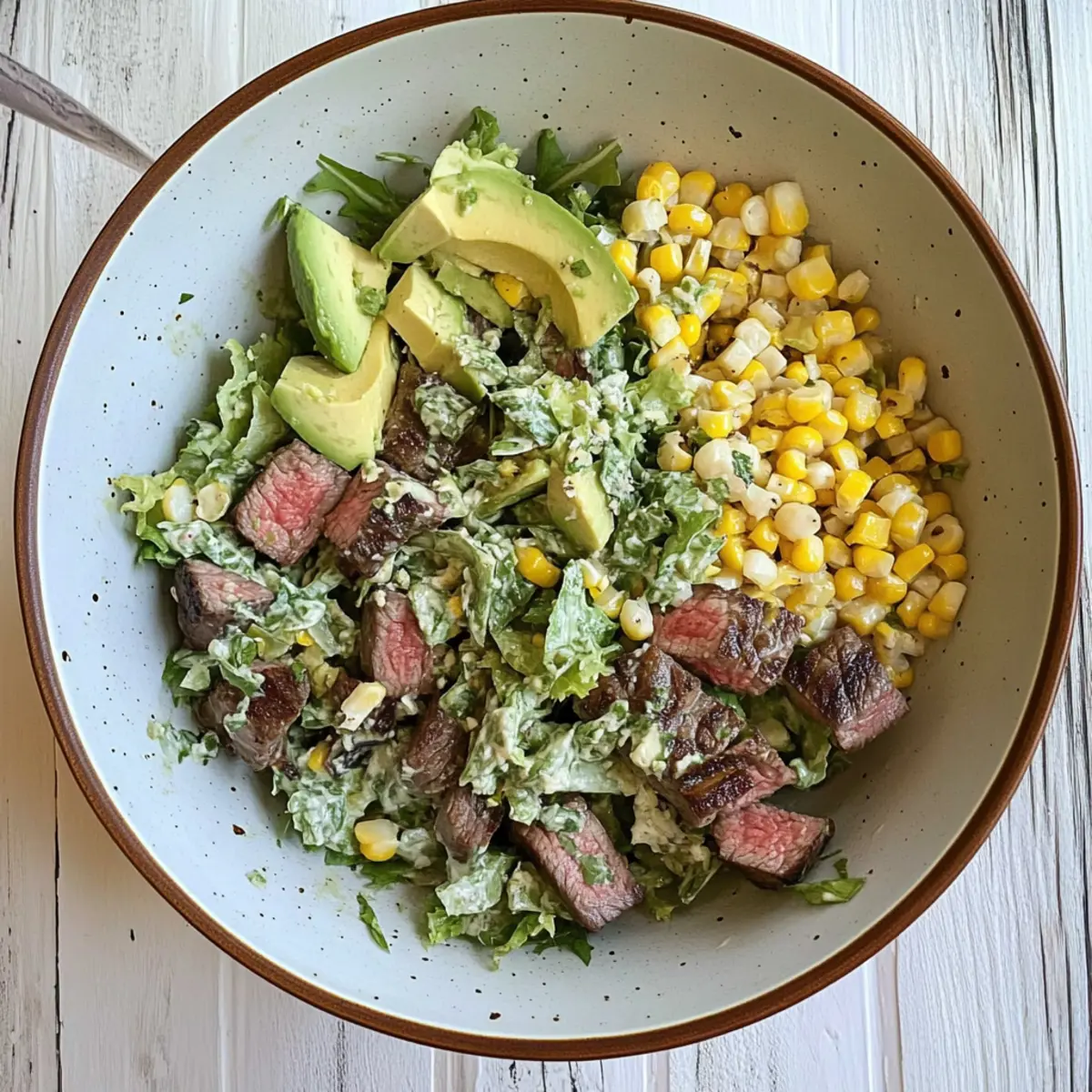 - In a large mixing bowl, arrange chopped romaine lettuce, followed by cubed steak, grilled corn, diced avocado, cotija cheese, marinated red onions, and chopped chives. Drizzle with dressing and toss gently.