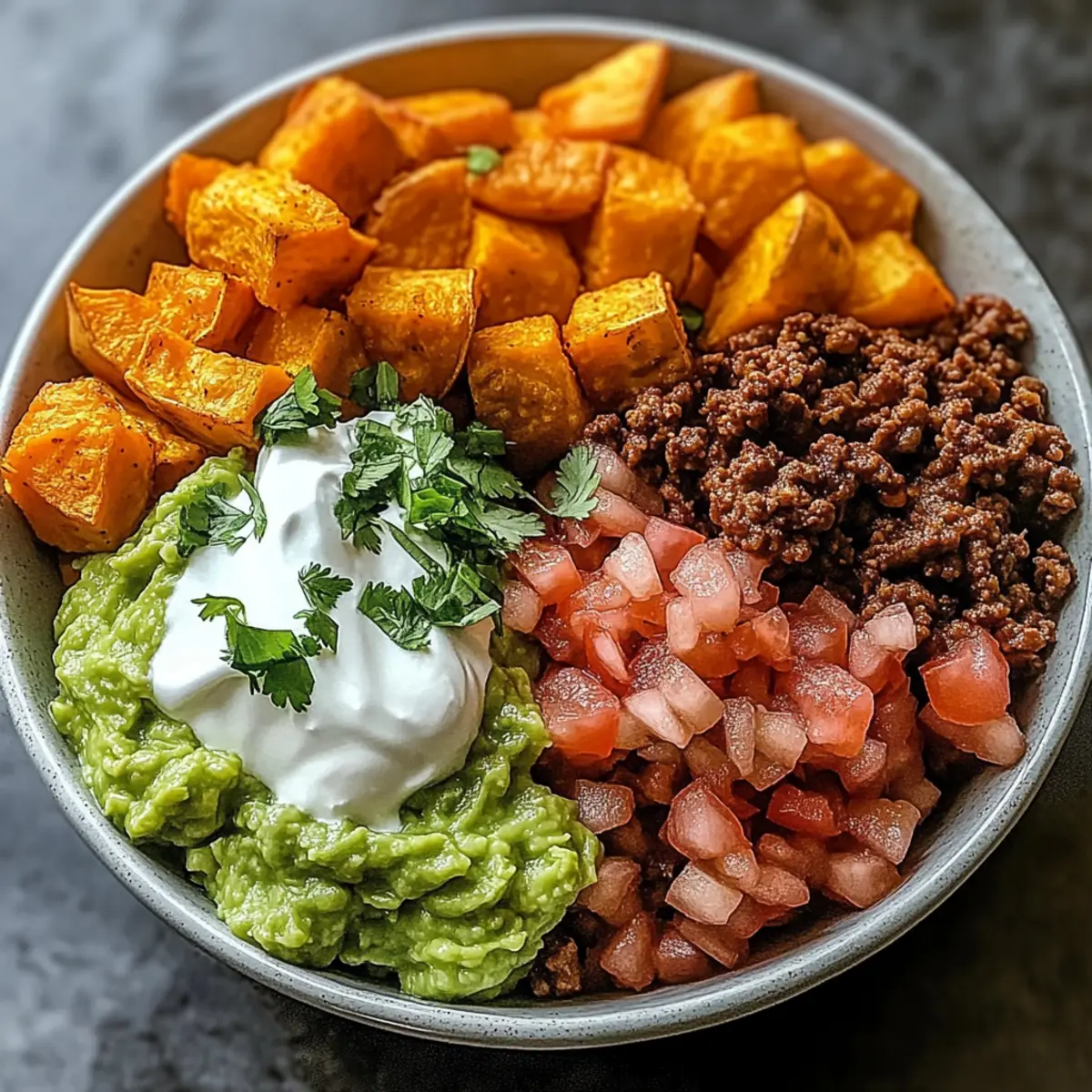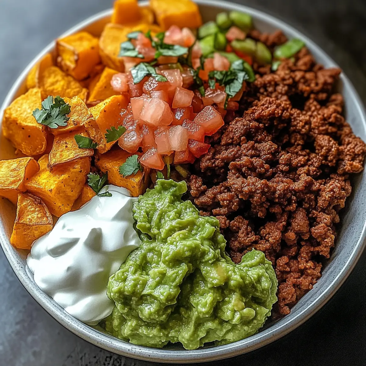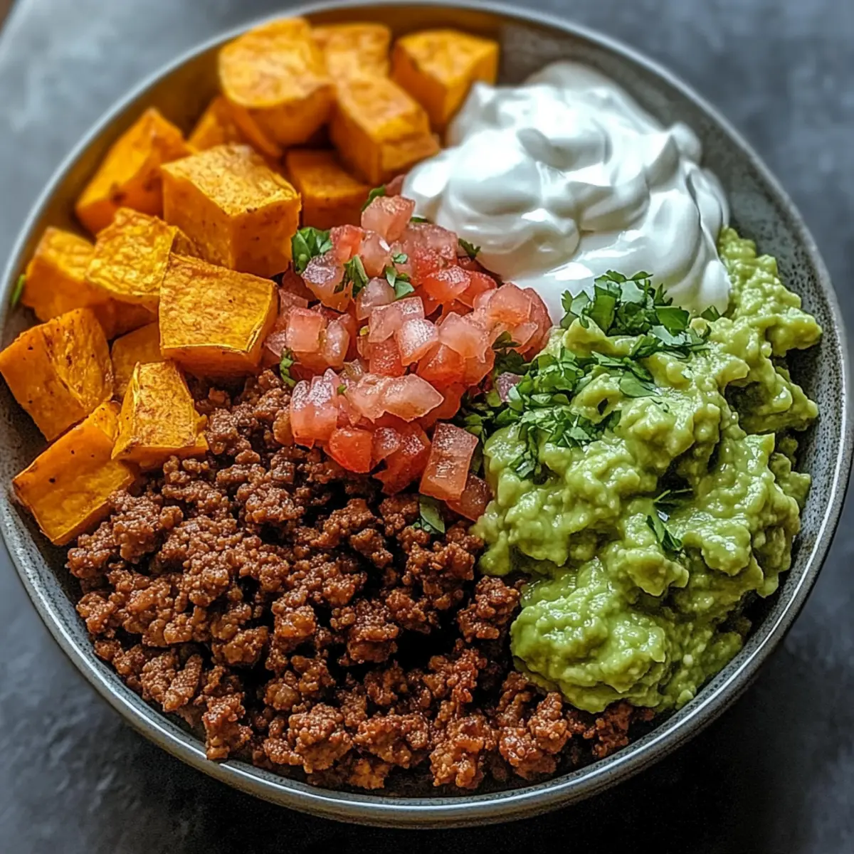 - Assemble your bowls starting with roasted sweet potatoes, then layer with seasoned taco beef, pico de gallo, guacamole, and sour cream.