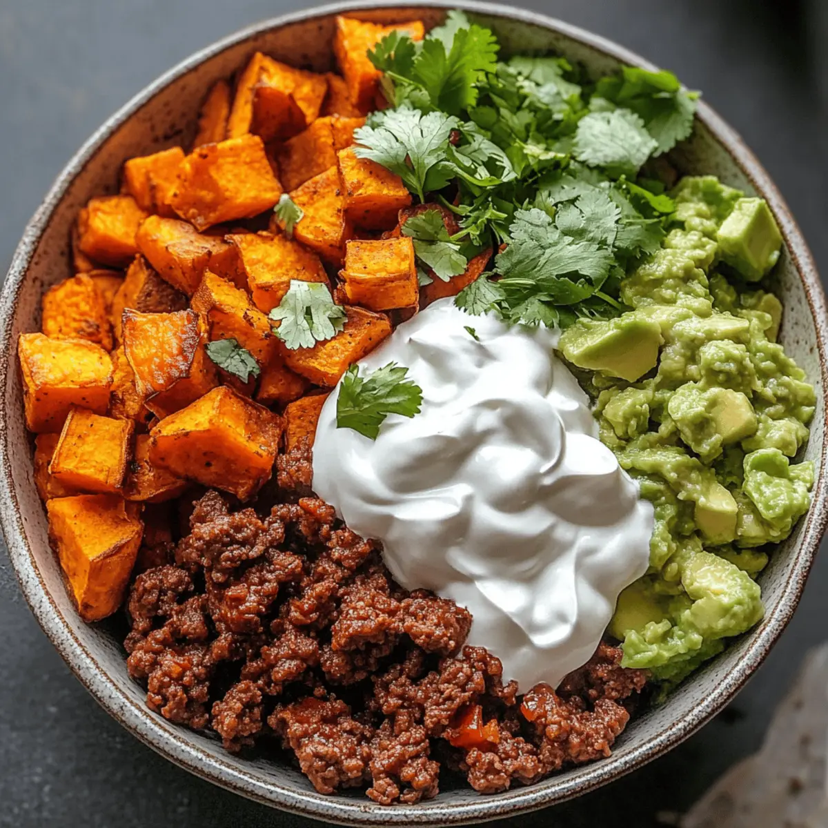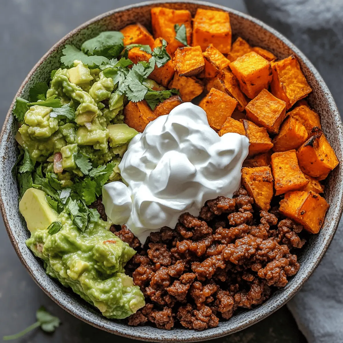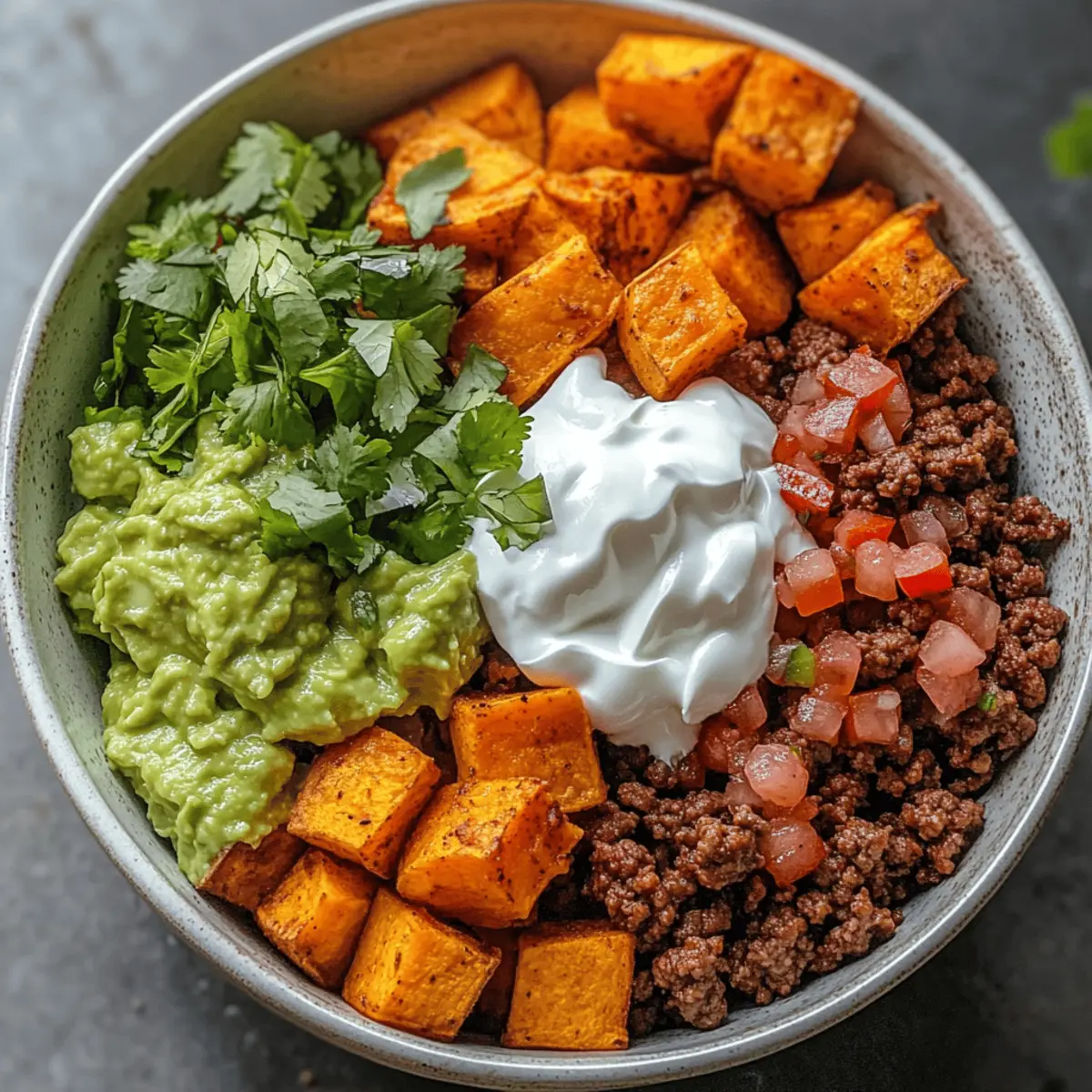 - Layer roasted sweet potatoes as the base in large bowls, followed by seasoned beef. Top with pico de gallo, guacamole, and sour cream.