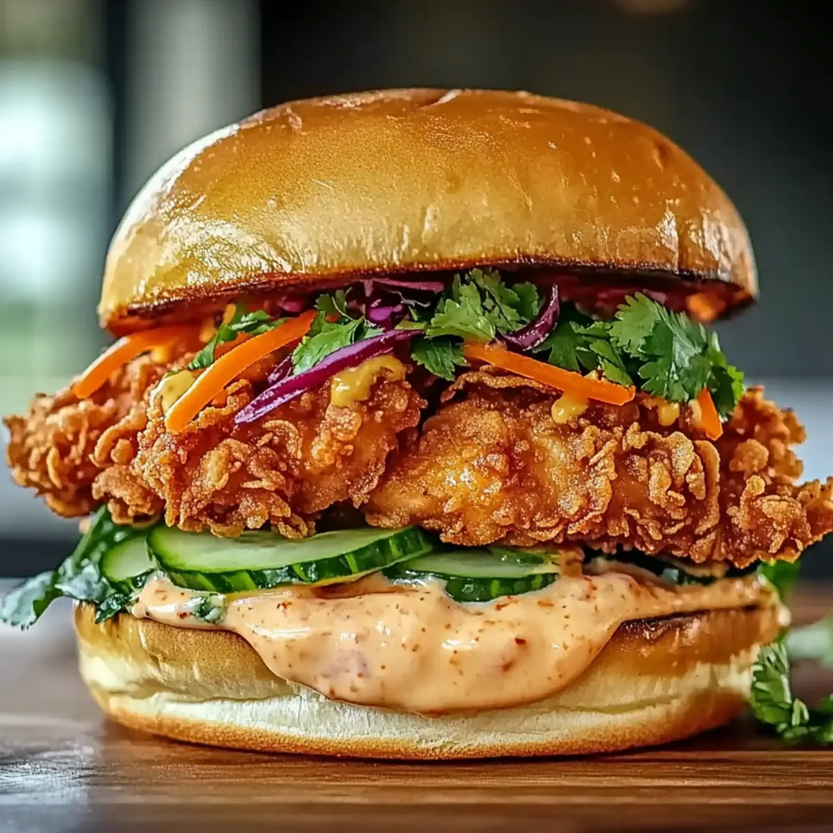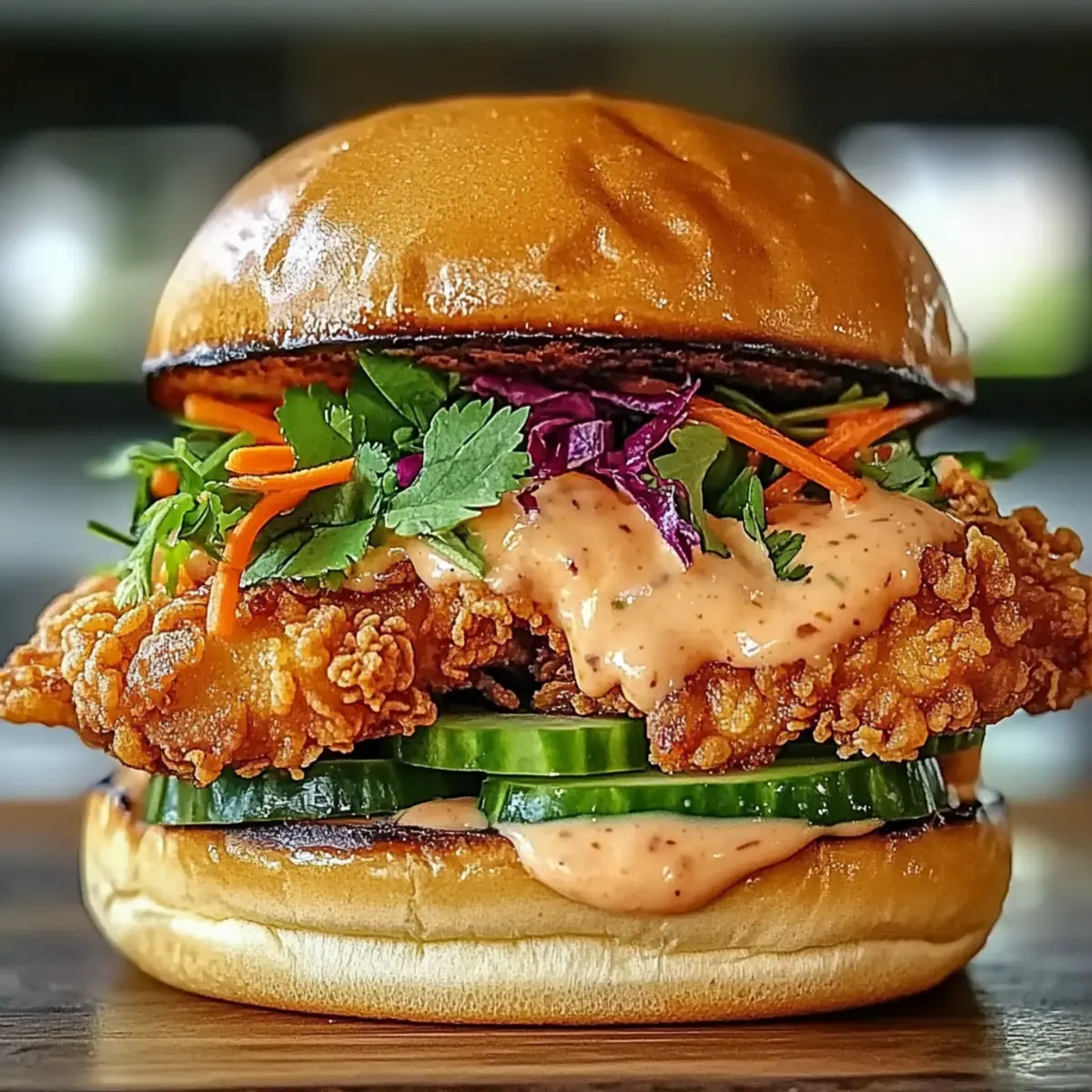 Take toasted buns and generously spread the spicy mayo on both sides. Layer the bottom bun with the crispy fried chicken, followed by fresh cucumber slices, pickled carrots, and a handful of fresh herbs like cilantro and Thai basil. Press the top bun gently to complete your flavor-packed Thai Fried Chicken Sandwich, ensuring all those delightful ingredients are encased.