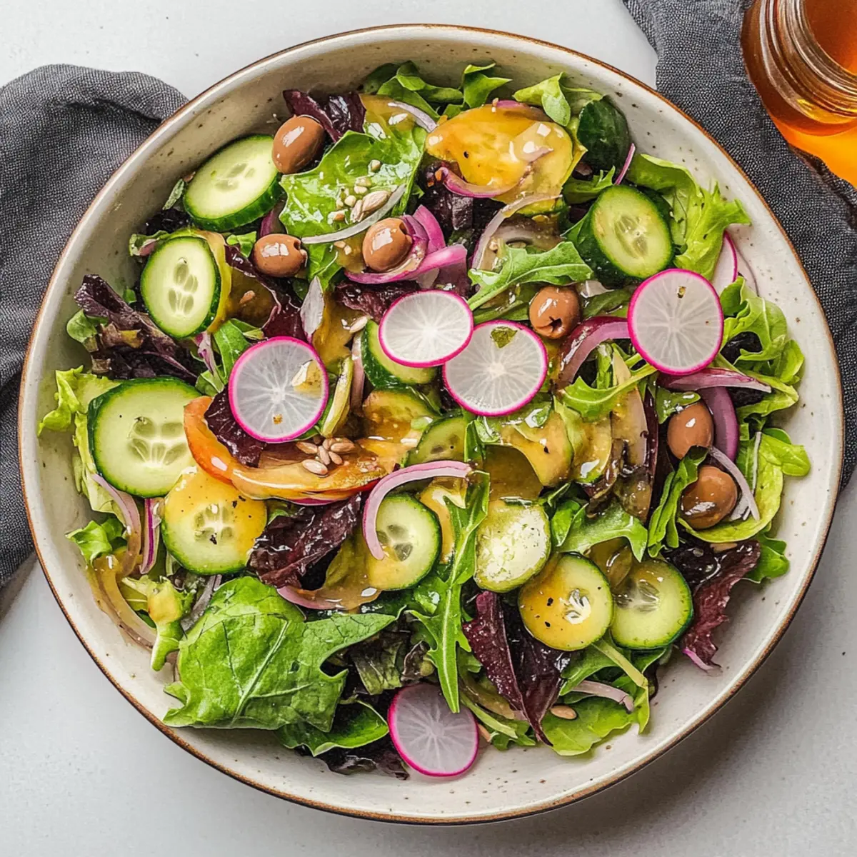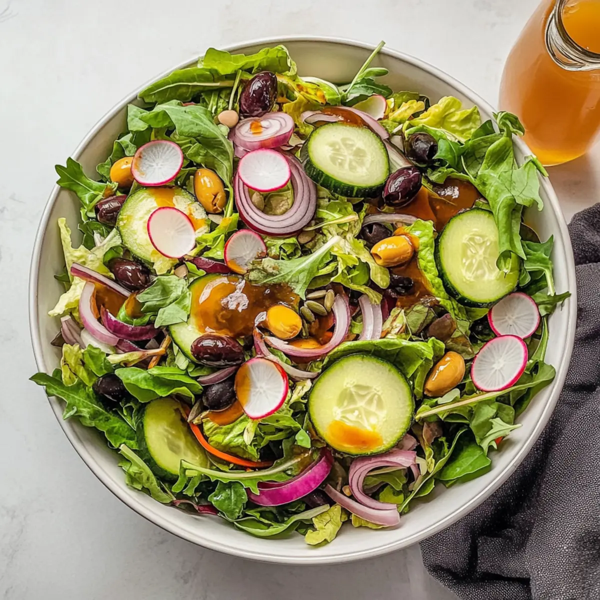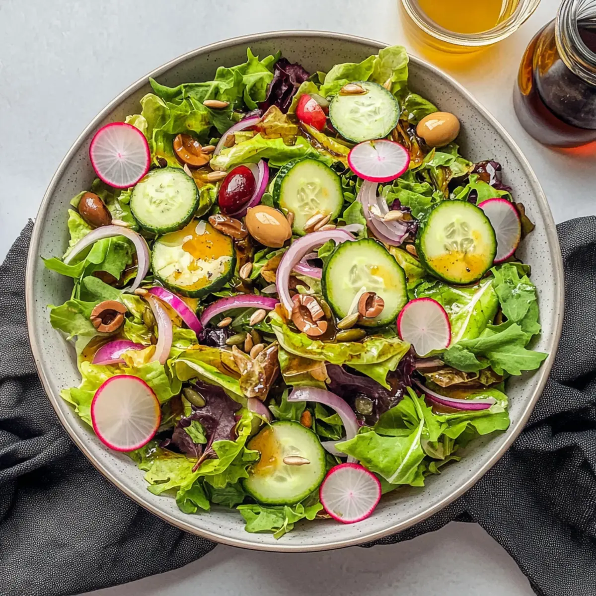 These colorful tossed salads are perfect for meal prep enthusiasts! You can chop most of the salad ingredients—like mixed lettuce, cucumbers, radishes, and red onions—up to 3 days in advance. Store them in an airtight container in the refrigerator to maintain their quality and crunch. To enjoy the freshest salad possible, keep the dressing separate in a small jar, where it can last up to 1 week. When you’re ready to serve, simply drizzle the dressing over the salad and toss gently for a delightful combination of flavors. This prep-ahead strategy not only saves time but also ensures a delicious, vibrant tossed salad that’s just as crisp and tasty!