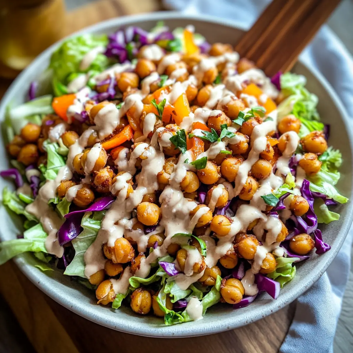 Drizzle half of the creamy tahini dressing over the salad mixture and toss gently to combine, ensuring all ingredients are coated in the dressing. Top the salad with the crispy chickpeas for that satisfying crunch. Finish by drizzling the remaining dressing over the top, adding a rich layer of flavor to your crispy vegan chopped salad.