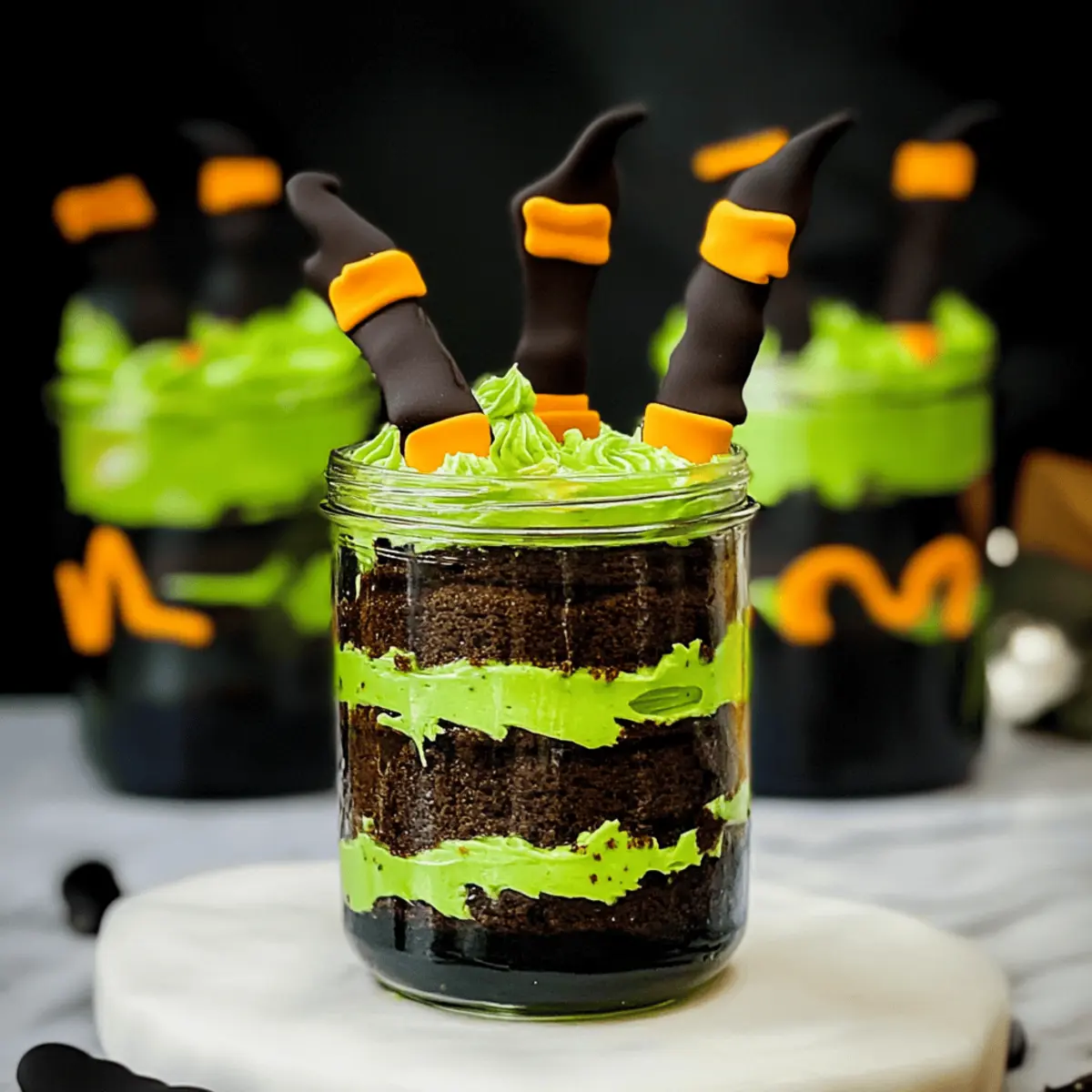 - Layer cooled chocolate cake with buttercream in jars, topping with sprinkles and placing fondant witch legs on top.